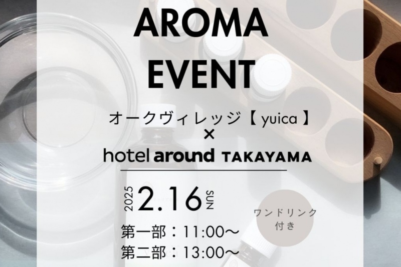 いつもhotel around TAKAYAMAをご利用いただき、誠にありがとうございます。 hotel around TAKAYAMAでは、GOOD LOCAL100の「オークヴィレッジ」様と コラボレーションしたアロマイベントを開催いたします。
